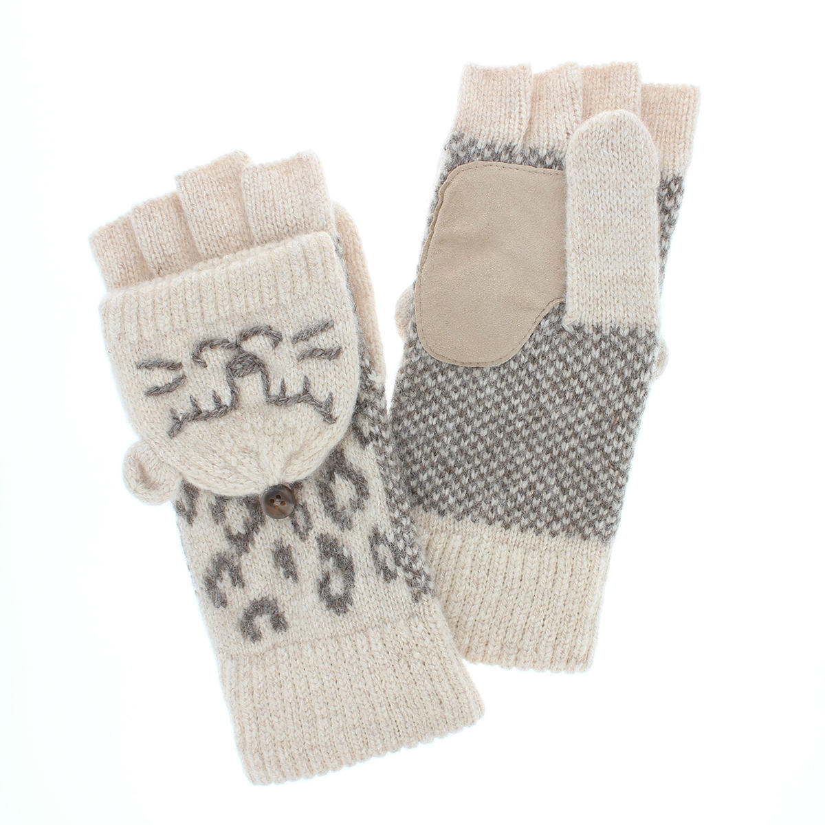 | 商品紹介 | フードをかぶせてミトンになる、2WAYタイプのニット手袋。はめたままスマホ操作もできて便利です。顔はすべてハンド刺繍です。 |