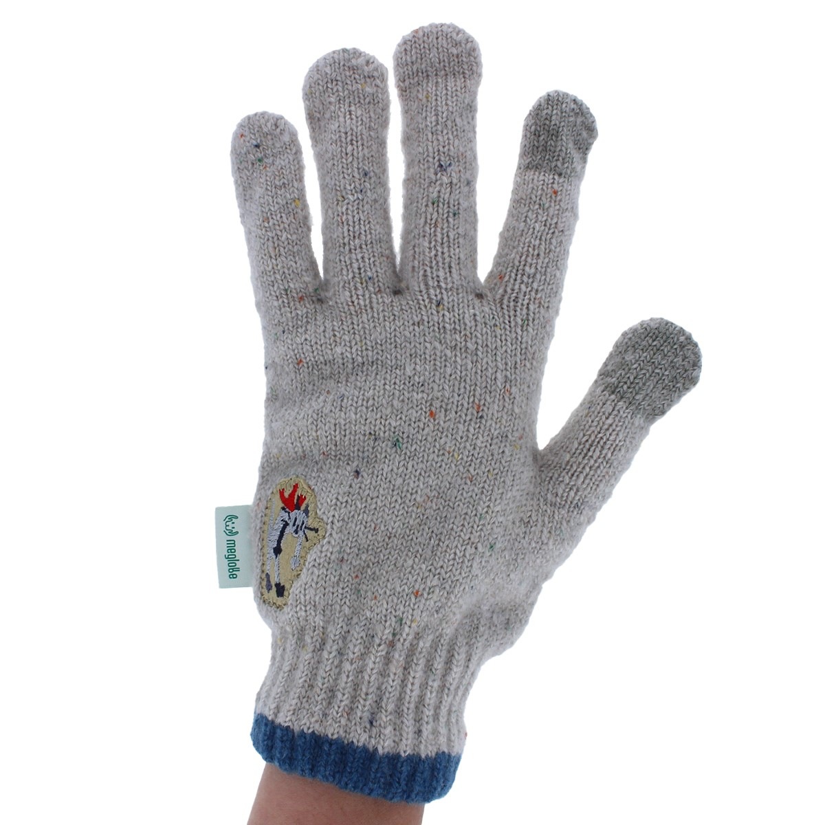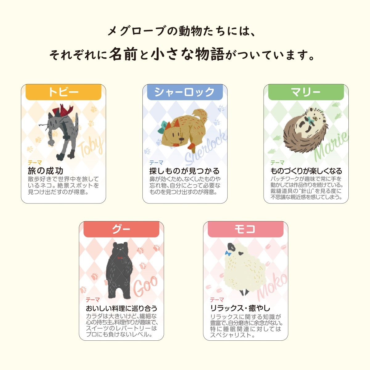 それぞれのテーマを持つかわいいキャラクターが手袋に刺繍されている、手も心も温まるブランド【メグローブ】が誕生しました。弊社のある香川県は犬の殺処分数が7年連続でワースト第1位という悲しむべき状況にあります。香川県の企業として、手袋メーカーとして、何か出来る事はないかと考え、現状改善の一助となればとの願いを込めて、保護犬猫の飼育、譲渡活動をしている団体に、売り上げの一部を寄付させて頂きます。 スマートフォン対応の5本指タイプのニット手袋です。柔らかな素材を使用しており、手当たりも抜群です。 サイズ: 婦人用フリーサイズ 総丈22cm 素 材: アクリル・ナイロン・ポリウレタン・ポリエステル 原産国: 日本