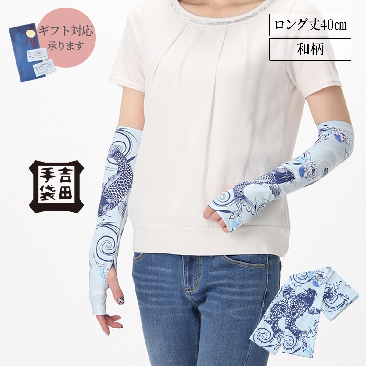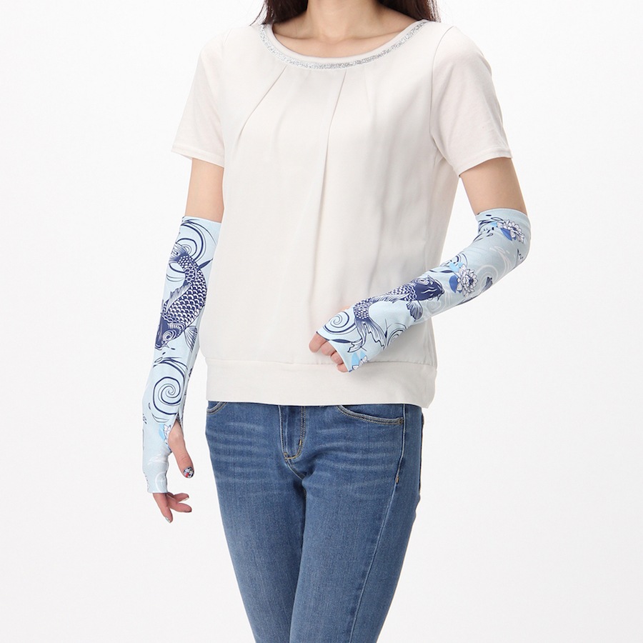 吉田手袋オリジナル【和柄シリーズ】です。春柄・夏柄2種類のアームカバー。春は桜・七宝・鯉、夏は金魚・千鳥・富士山をモチーフに、日本の四季をイメージしました。素材:ポリエステル100%