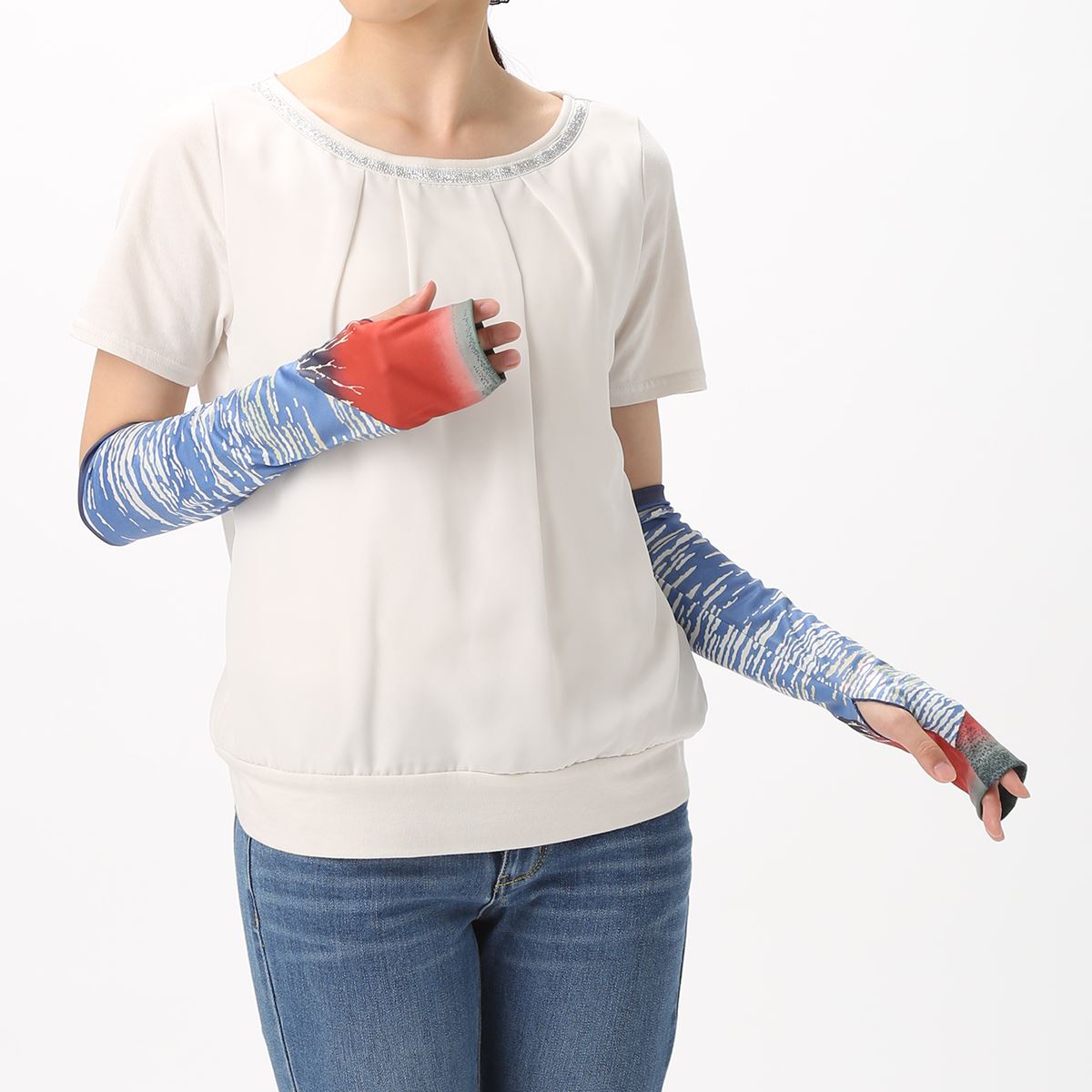 吉田手袋オリジナル【和柄シリーズ】です。春夏柄・秋冬柄2種類のアームカバー。春夏は鯉・富士山、秋冬は雲をモチーフに、日本の四季をイメージしました。素材:ポリエステル100%