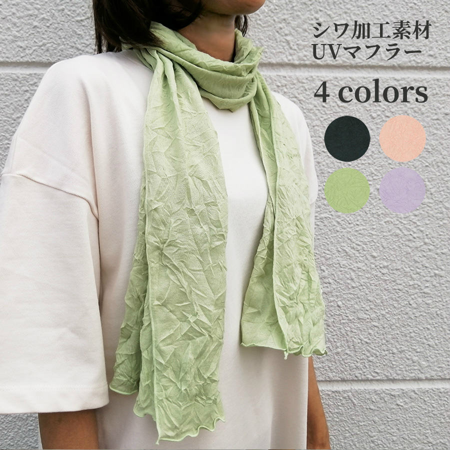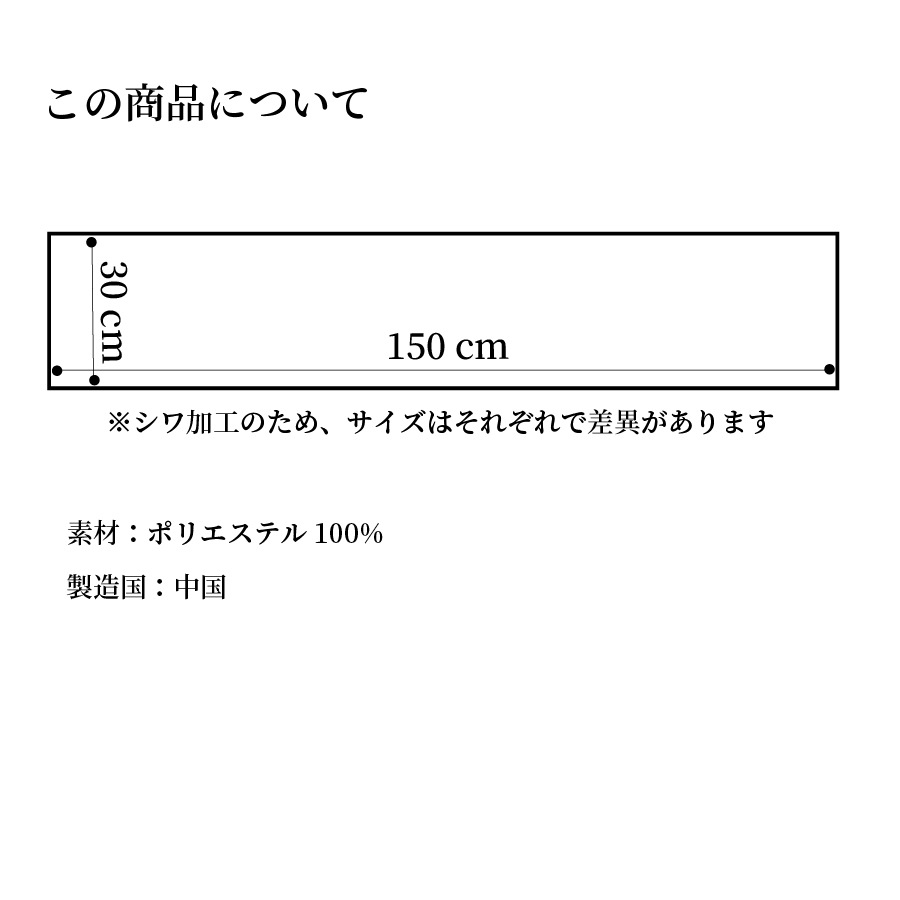 首周りの紫外線対策にぴったりのサマーマフラーです。 幅が細めでコンパクトにたためるので、外出時にバッグに入れて必要時にサッと巻いても。冷房による冷え対策にも。 サイズ: 150×30 cm 素材: ポリエステル100% 原産国: 中国 ※こちらの商品は、倉庫での保管中に折シワなどが強く入っている場合がございます。必要に応じて、水通しをして広げて干すなどしてからご使用ください。
