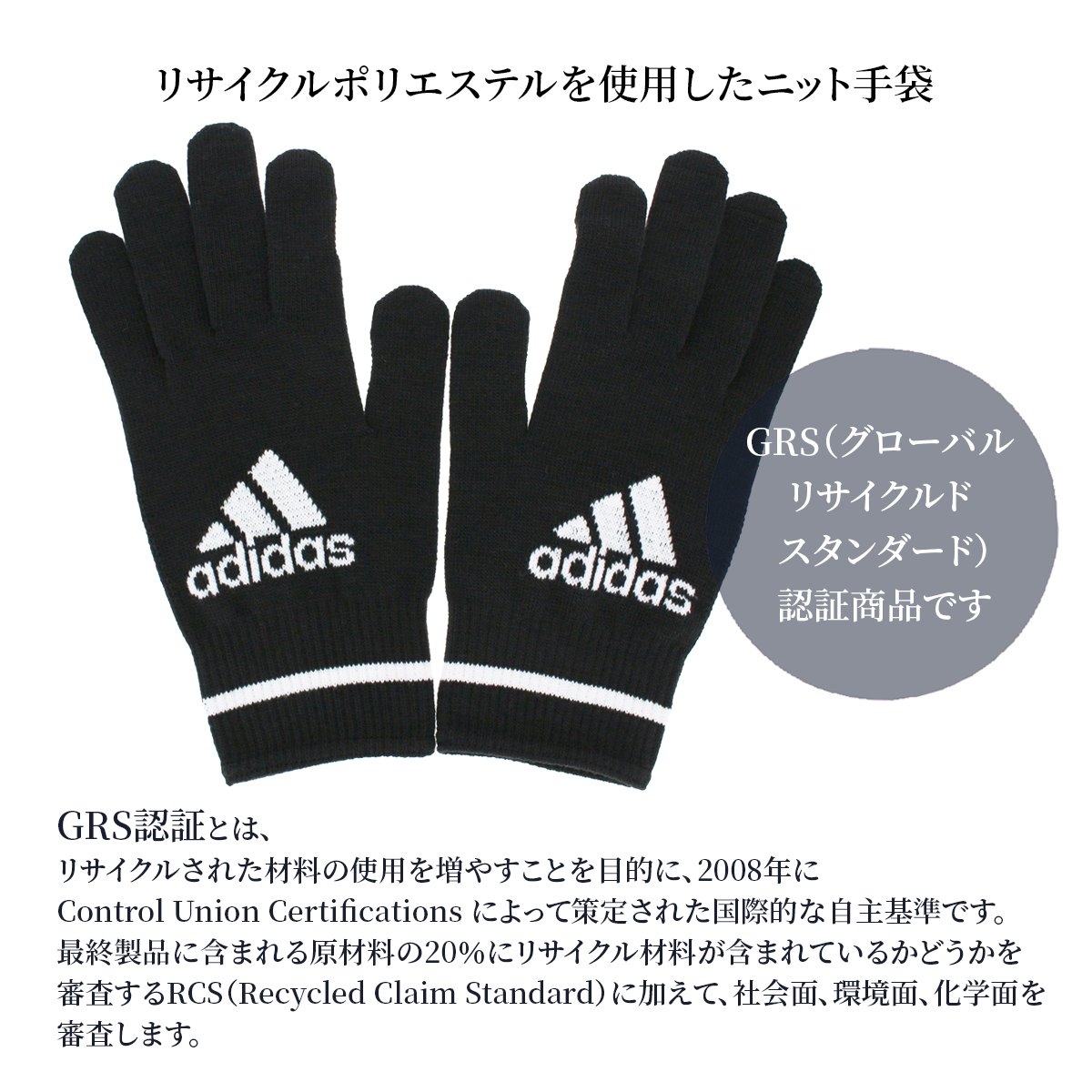リサイクルポリエステルを使用した人気ブランドアディダスのニット手袋です。冬の寒い室内でパソコンを使用する時、私達は手袋を使用する事があります。従来のスマホ対応手袋だと「キーボードが隠れて入力しづらい」、「分厚い手袋だと動きが制限される」という悩みから、指をサイドスリットから出すタイプの薄手の手袋が完成しました。もちろん、屋外でもお使い頂けます。スマートフォンやタッチパネルを直接触れられるので、指紋認証にも対応。ストレッチがあり、手にフィットするので、着脱がしやすく、細かい作業がしやすい。薄手でスマートに見えるので、場所を問わずにご使用いただけます。こだわりの日本製。手洗い出来るのも嬉しいポイント。 こちらの商品はGRS(グローバル リサイクルド スタンダード)認証商品です。GRS認証とは、リサイクルされた材料の使用を増やすことを目的に、2008 年に Control Union Certifications によって策定された国際的な自主基準です。最終製品に含まれる原材料の20%にリサイクル材料が含まれているかどうかを審査するRCS(Recycled Claim Standard)に加えて、社会面、環境面、化学面を審査します。 サイズ: 男性用フリーサイズ 総丈25cm 素 材: 再生ポリエステル糸使用(ポリエステル・ナイロン・ポリウレタン) 原産国: 日本(自社工場)
