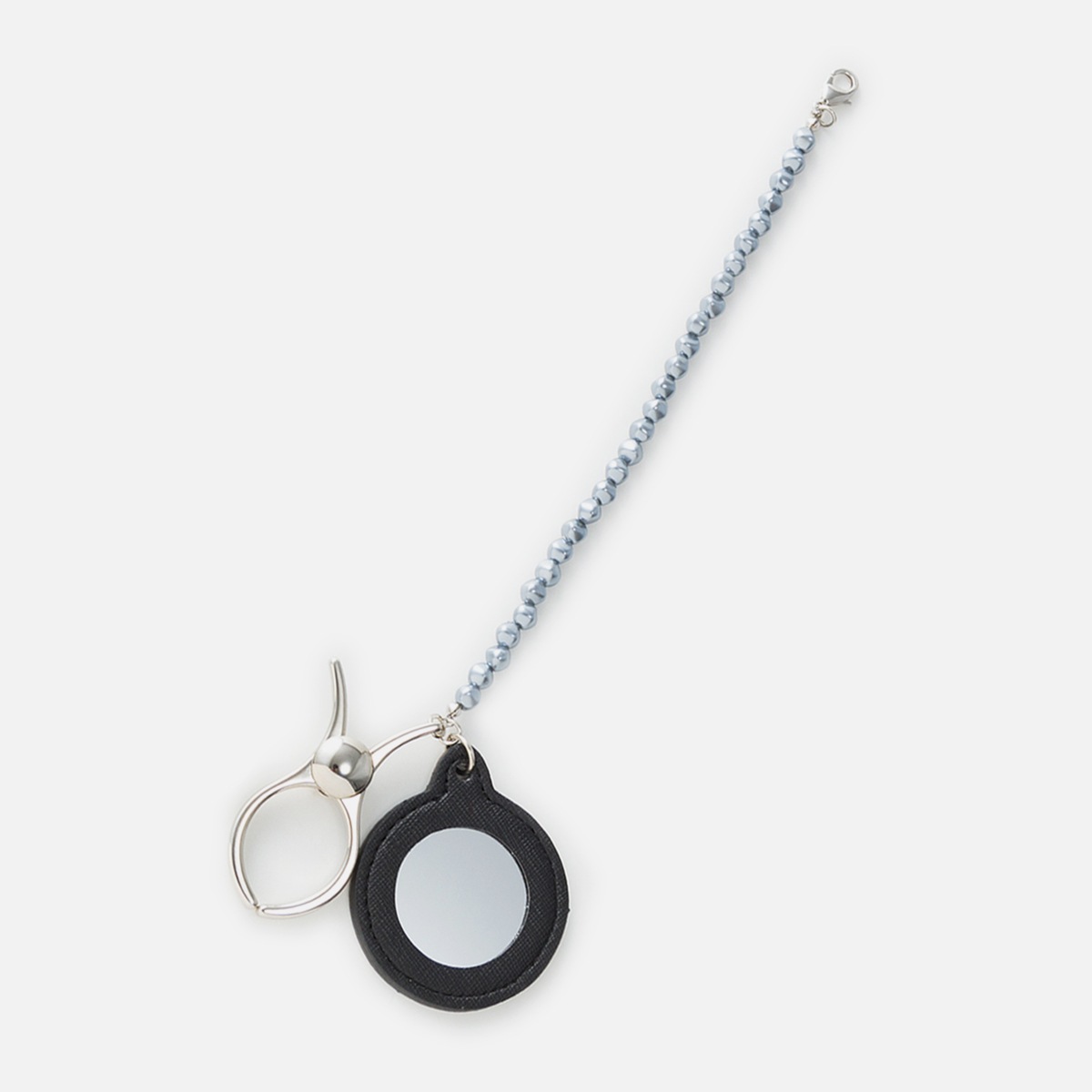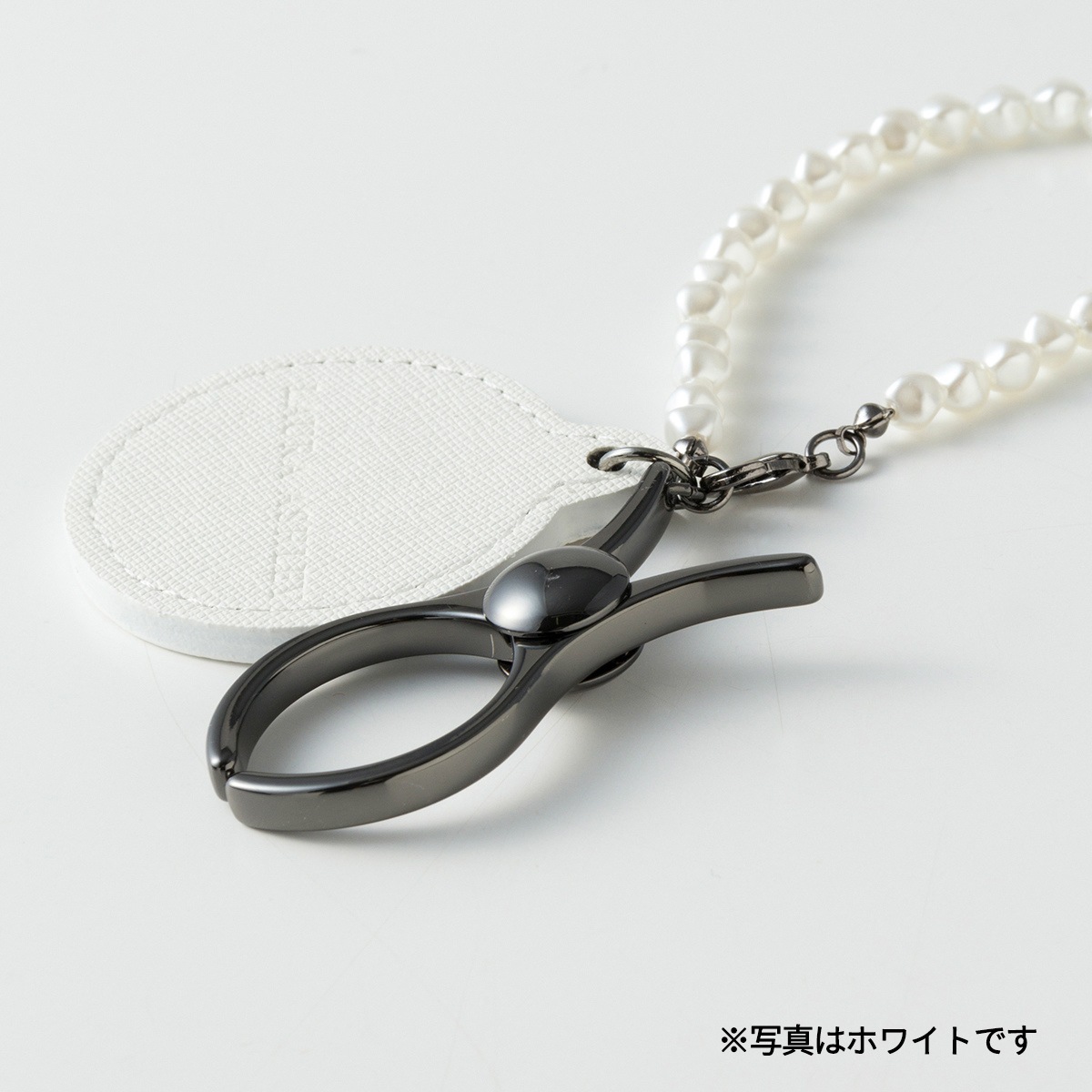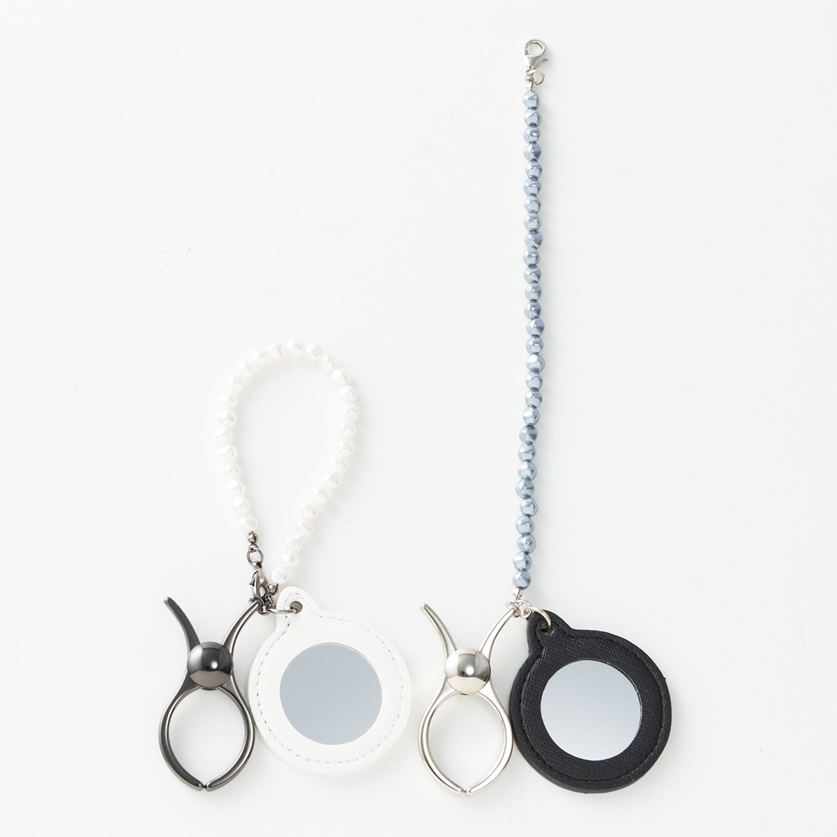 パールチェーンに、可愛いミラーがついたグローブホルダーです。素材:合成皮革・ユリア樹脂・亜鉛合金・真鍮・鉄