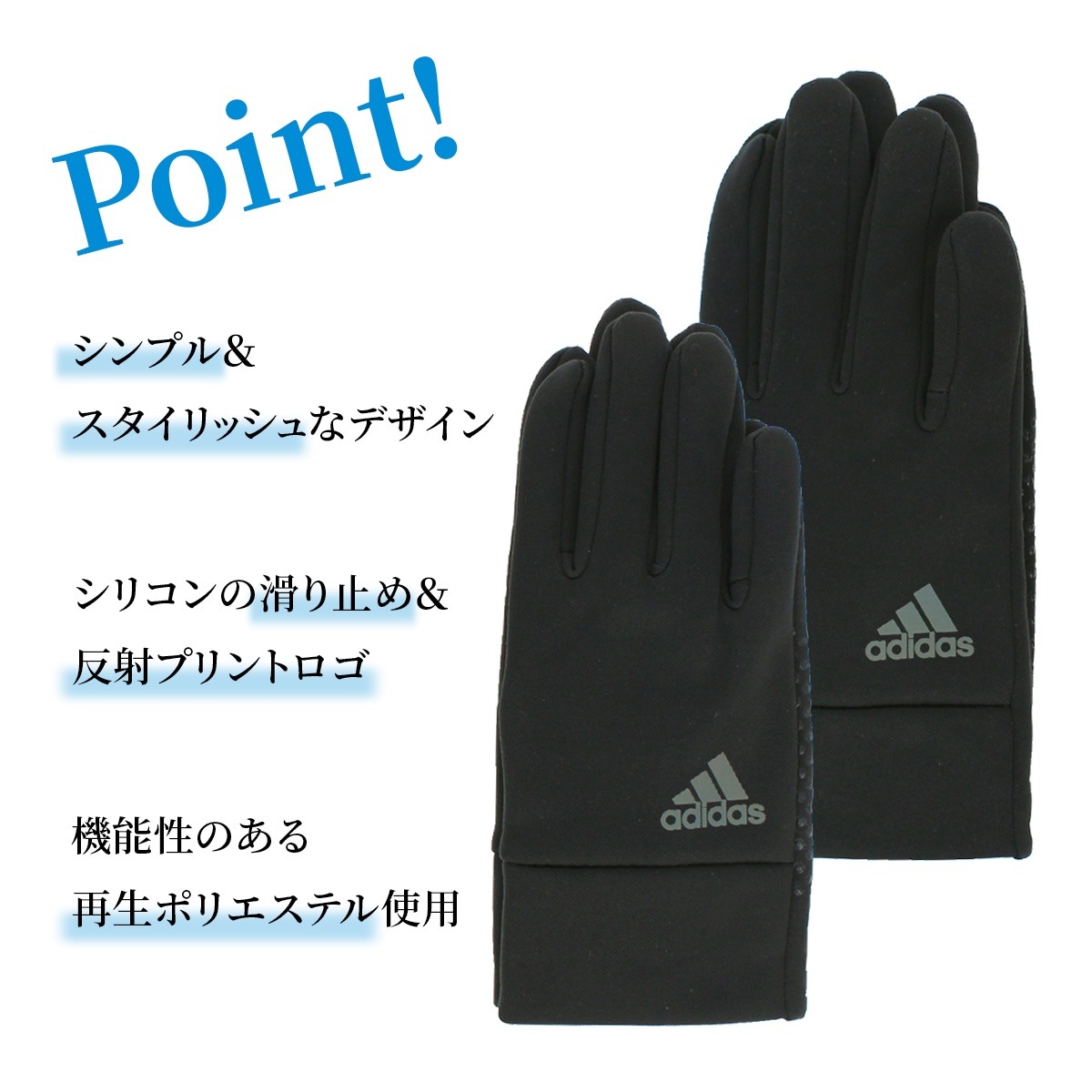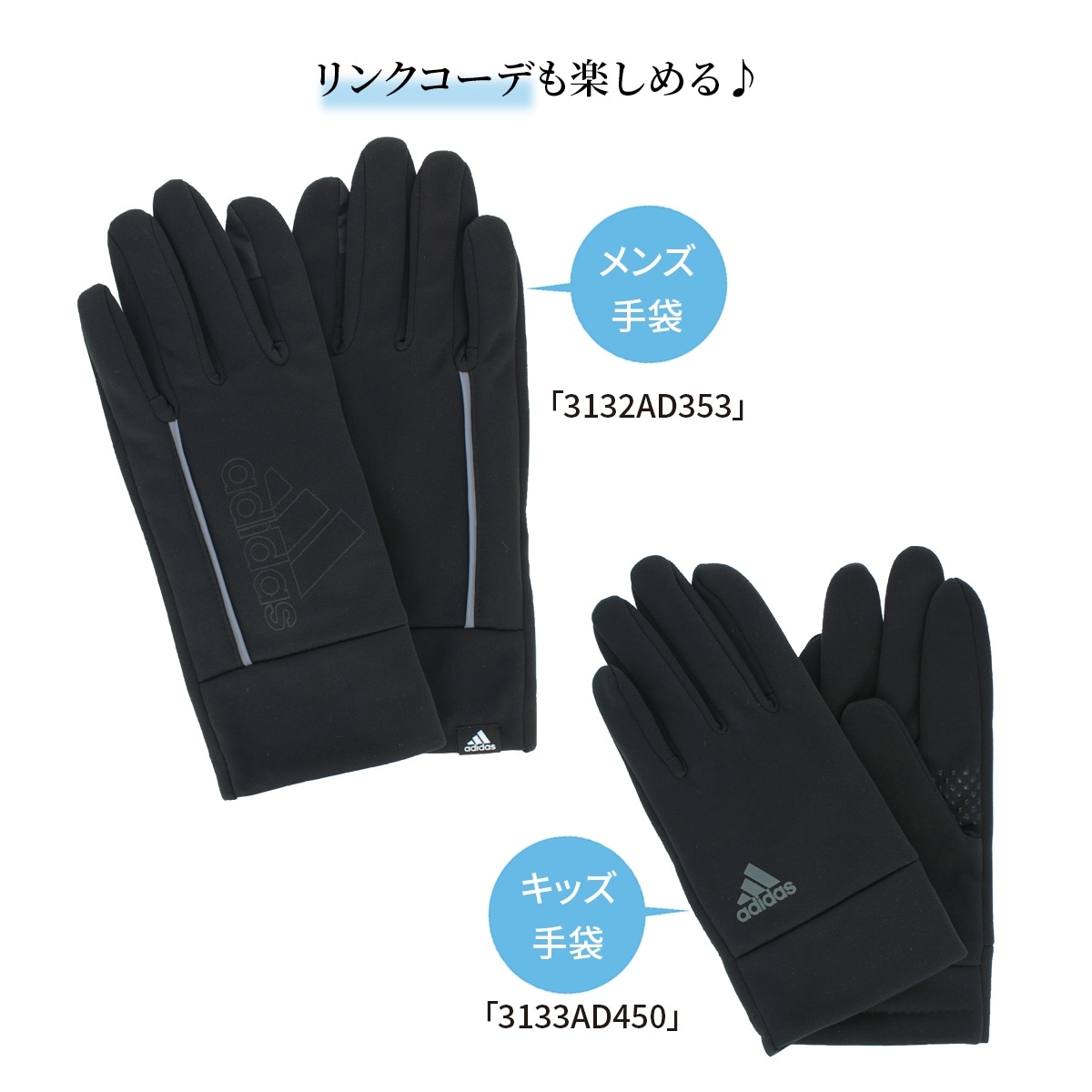 反射プリントのロゴがおしゃれな、大人気ブランドadidasのキッズ用手袋。環境配慮・サスティナブル素材であるウォームダールは肌触りの良い裏ボアで太陽光を利用した蓄熱保温素材のため、ふんわりと手を温めてくれます。シンプルでどんなコーディネートにも合わせやすいデザインなので、通学時やサッカーや野球などのスポーツの練習時、外遊びの時などに便利です。手洗いが出来るのも嬉しいポイント!すべり止めも付いているので、自転車の運転などにもお使いいただけます。大人っぽいカラーとシンプルなデザインで、プレゼントやクリスマスギフトにもピッタリです。 メンズ手袋(3132AD353)とリンクコーデもおススメです。 サイズ: 手囲い:19cm(10~12才)キッズ総丈:20cm