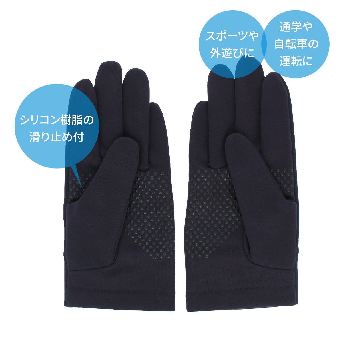 手囲い:17cm(7~9才)キッズ総丈:18cm 素材:ポリエステル100% スマートフォン対応:- 滑り止め:○ 厚み:やや薄手 伸縮性:△ 原産国: カンボジア(自社工場)