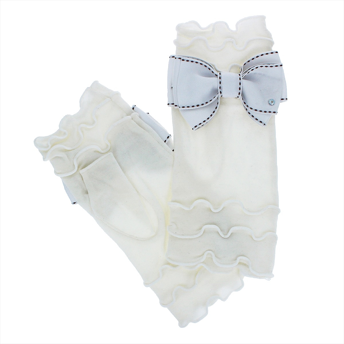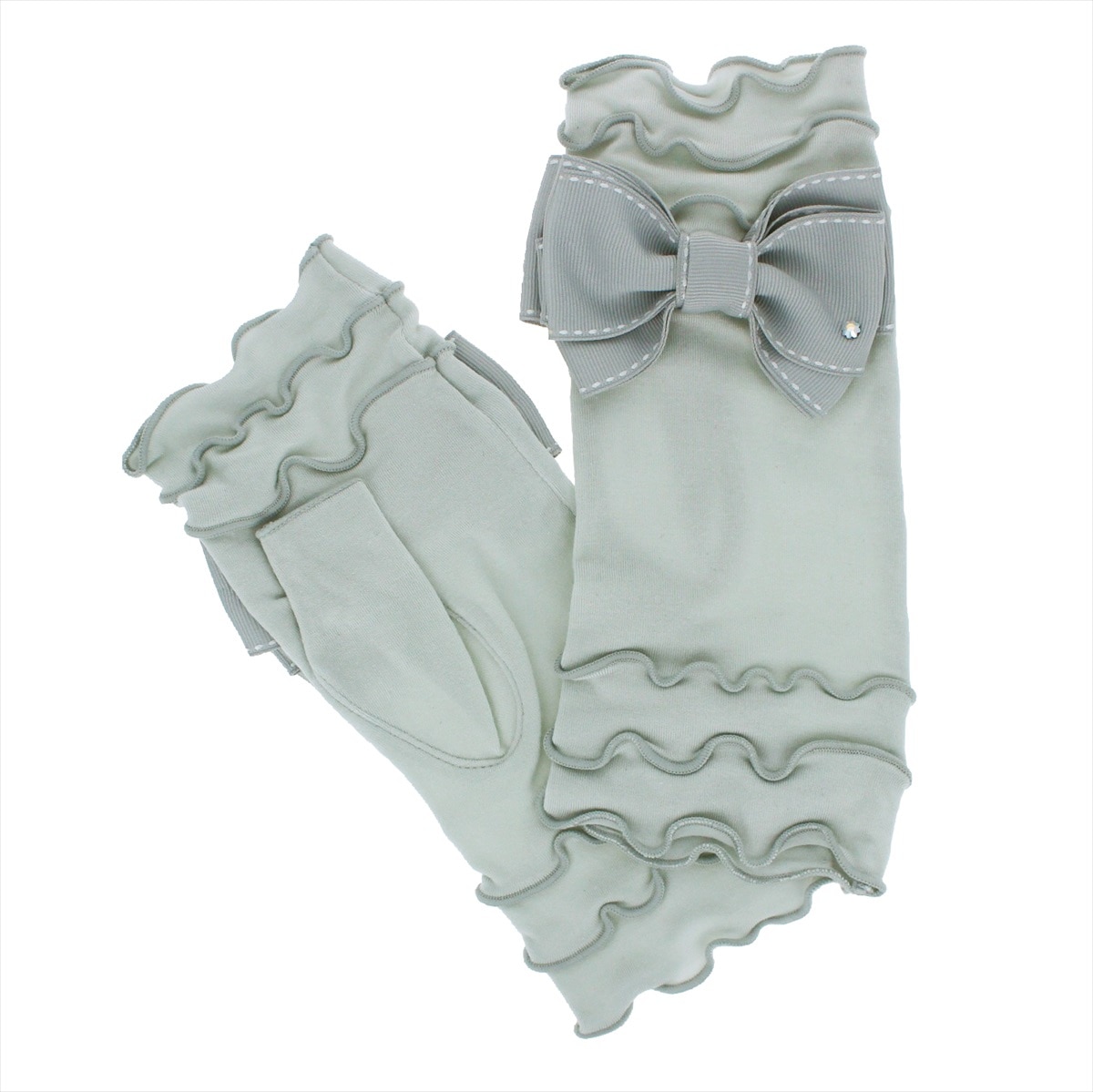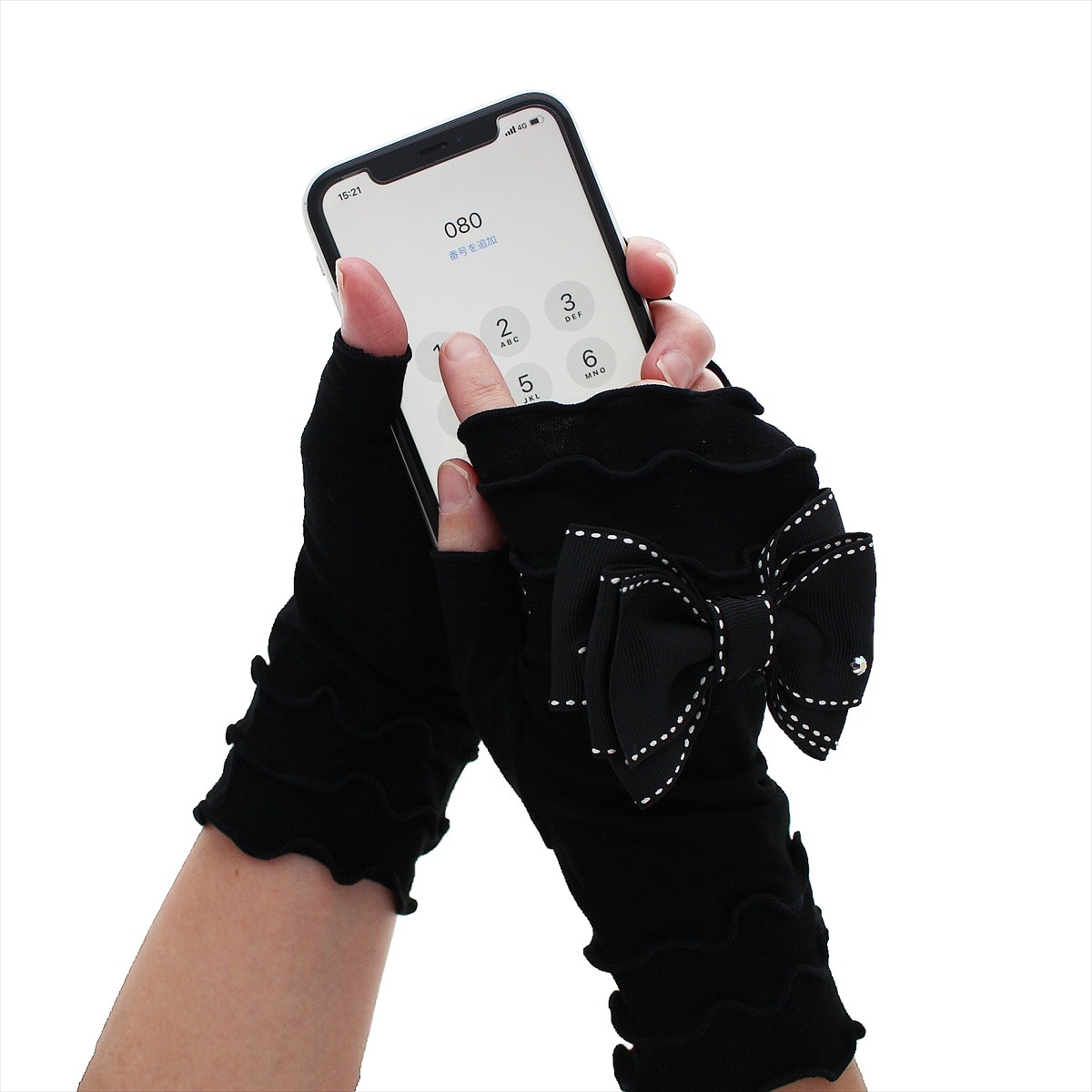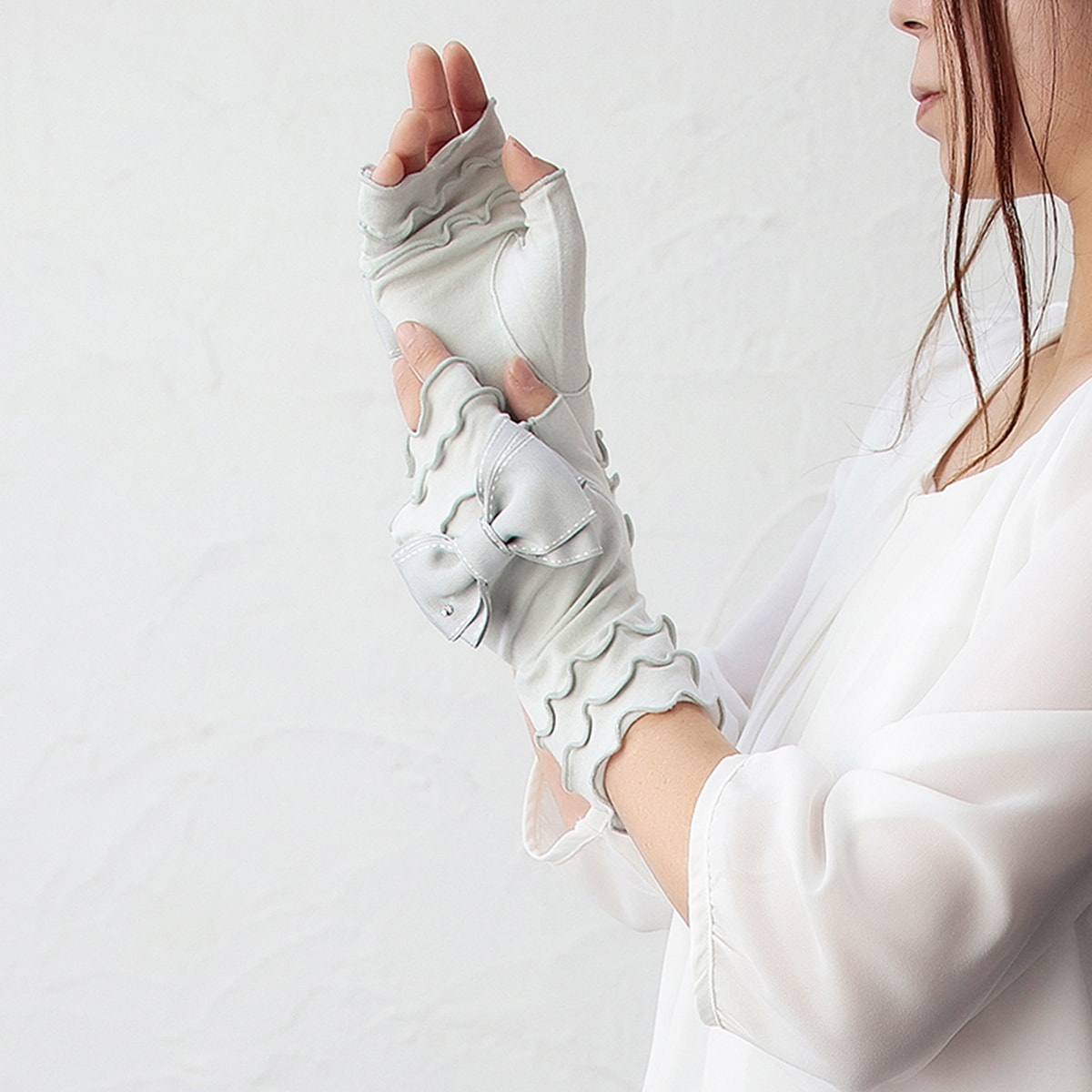 京都の水尾の柚子果皮から抽出したフロラルウォーターを生地に加工した、抗菌素材を用いた、ショート丈のUVカット手袋です。大ぶりのリボンにスワロフスキーのストーンがきらりと光る人気ブランドアルタクラッセらしいエレガントなデザインです。ストレッチ性のあるひんやり接触冷感素材を使用しているので、暑い夏も快適にお使い頂けます。外での強い紫外線、室内でのエアコンの風など、夏の乾燥肌対策に嬉しいしっとり保湿機能も兼ね備えています。滑らかで心地の良い肌触り。手袋を装着したまま、細かい作業やコンビニでのキャッシュレス決済時にも慌てない指紋認証にも対応しているスマートフォンやタッチパネルがそのまま使える指先フリータイプです。自分へのご褒美や母の日ギフト、プレゼントにピッタリです。 サイズ: 手囲い:21~22cm(女性用) 総丈:20cm 紫外線遮蔽率:ブラック 99.9%,グレー 97.0%,オフホワイト 97.7% 素材:レーヨン・ポリウレタン リボン部分 ポリエステル100% 滑り止め:- 伸縮性:◎ 原産国: 中国(自社工場)