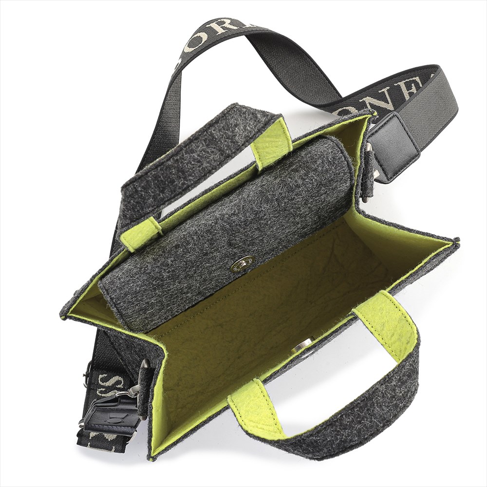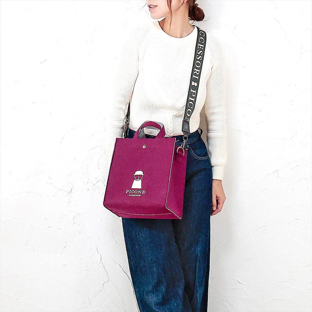 表地と裏地の配色が可愛いフェルト素材の2WAYバッグ。おしゃれなロゴベルトのショルダー部分は取り外し可能で、ショルダー部分を外して、ハンドバッグとしてもご使用いただけます。マチが大きく収納力が抜群で、大きく開く間口は荷物が取り出しやすく便利です。開け口にはカバー付きで中身が見えないので安心です。内側には小物が整理できるオープンポケット1つ付きしっかりとした生地でシルエットが崩れる心配もなく、自立するのも嬉しいポイント!秋冬のコーディネートにピッタリなショルダーバッグです。サイズ: (W)24.5×(H)24×(D)14cm ショルダー部分 73~124cm重量:290g(本体:180g, ショルダー:110g) ポケット:内側:オープン×1素材: ポリエステル原産国: 中国