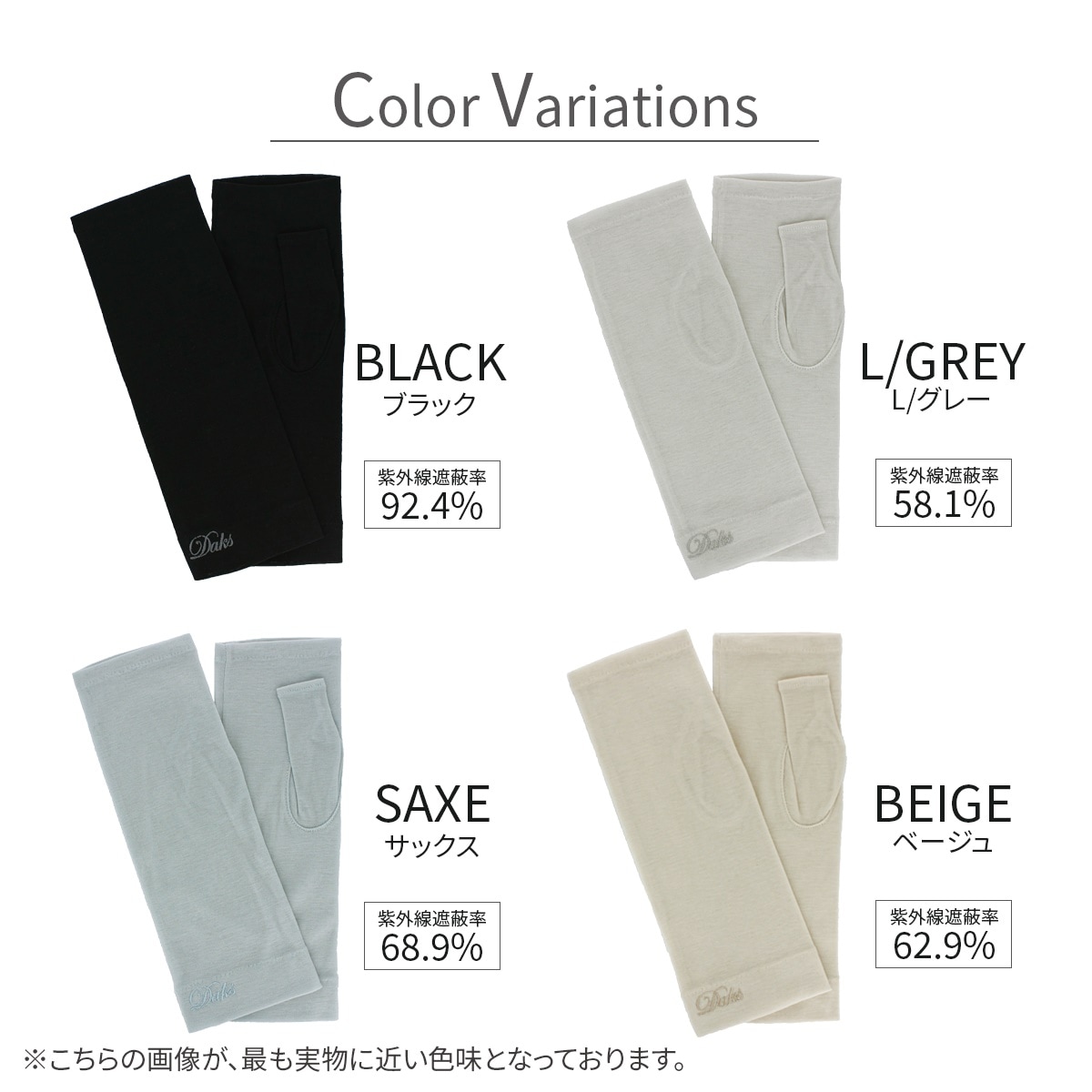紫外線遮蔽率:ブラック 92.4%, L/グレー 58.1%, サックス 68.9%, ベージュ 62.9%