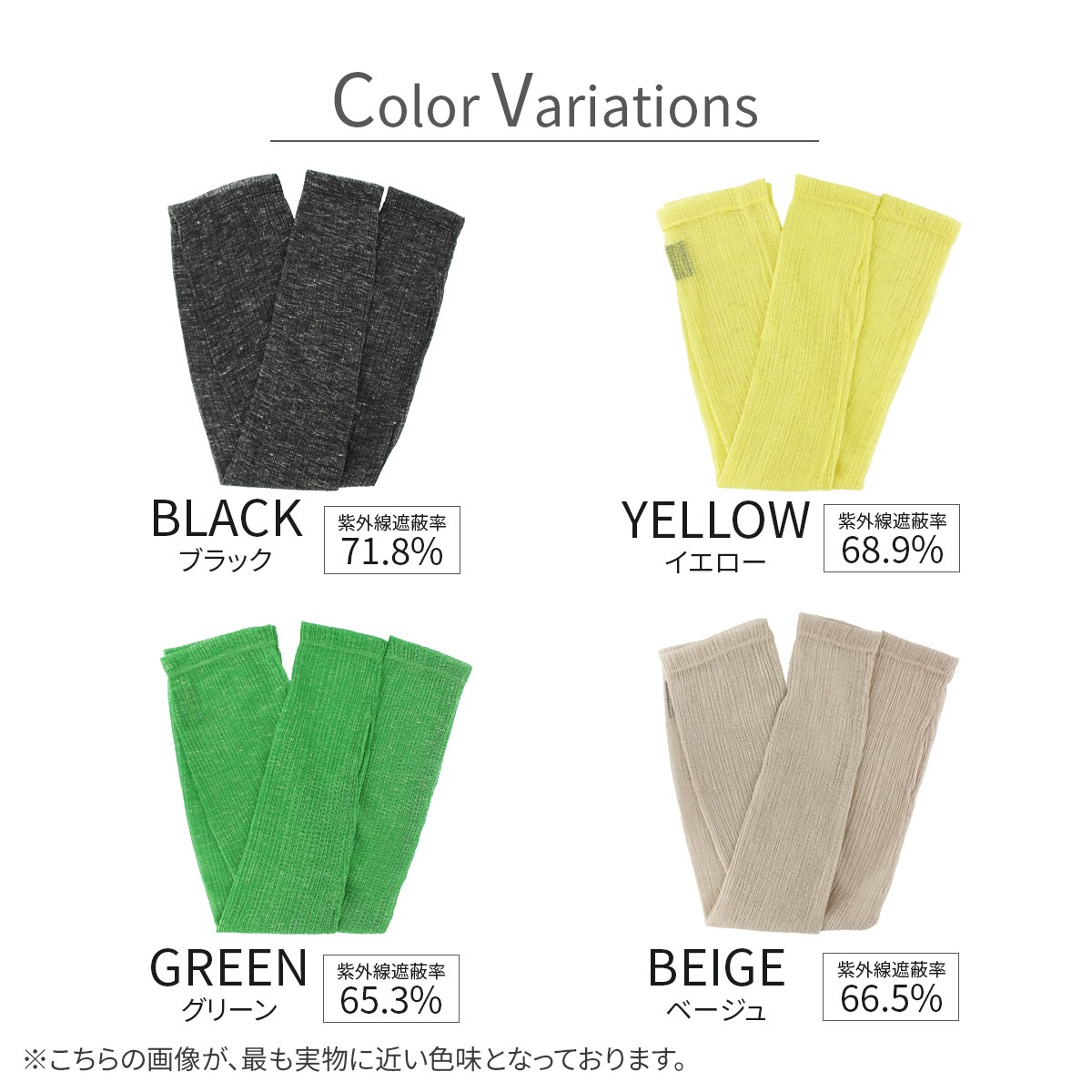 紫外線遮蔽率:ブラック 71.8%, イエロー 68.9%, グリーン 65.3%, ベージュ 66.5%