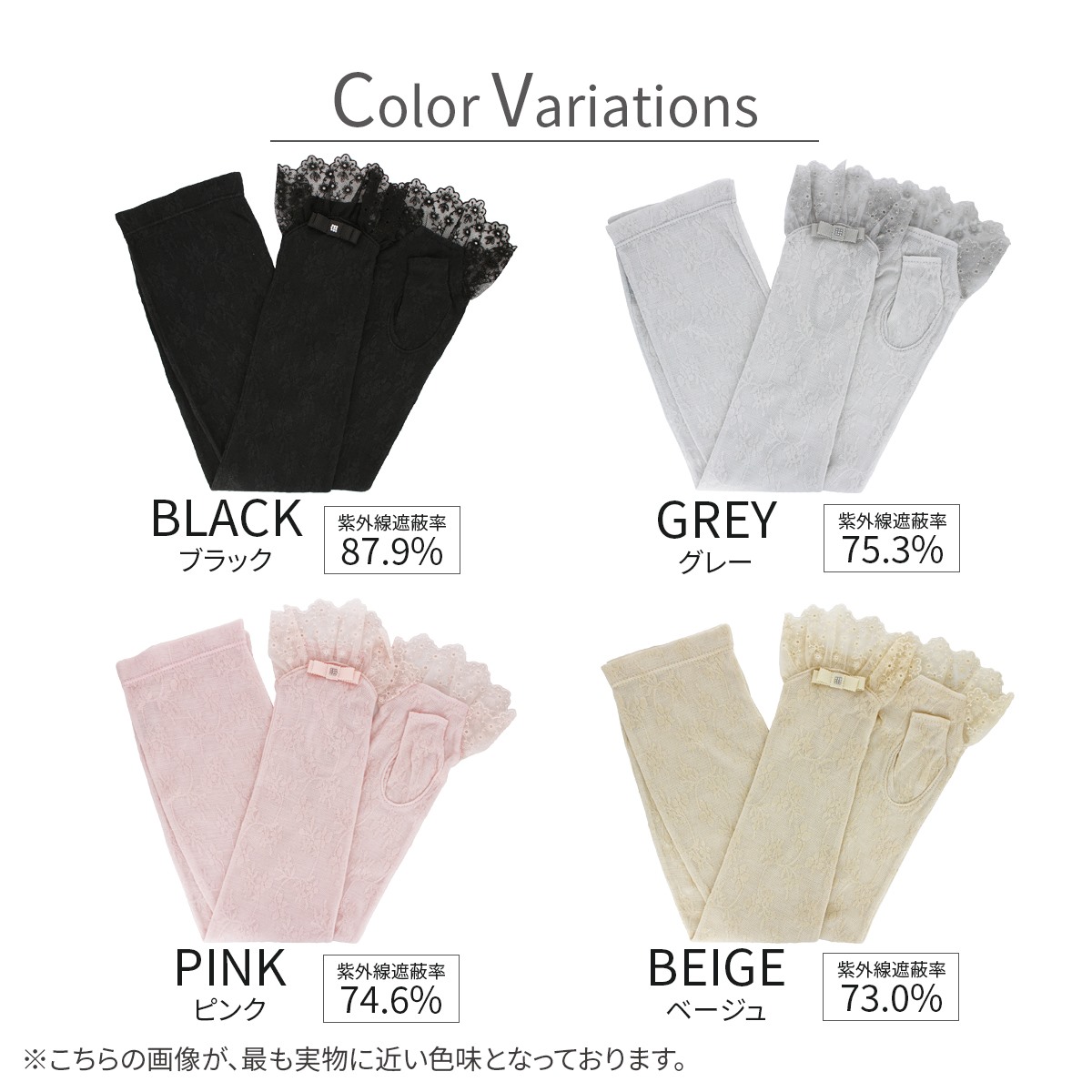 紫外線遮蔽率:ブラック 87.9%, グレー 75.3%, ピンク 74.6%, ベージュ 73.0%