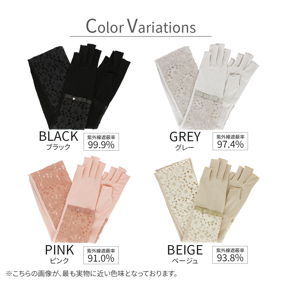 紫外線遮蔽率 ブラック 99.9%, グレー 97.4%, ピンク 91.0%, ベージュ 93.8%