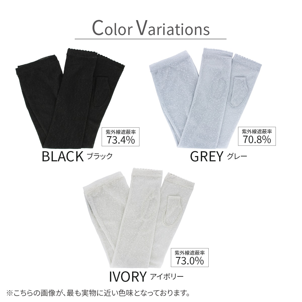 紫外線遮蔽率:ブラック 73.4%, グレー 70.8%, アイボリー 73.0%