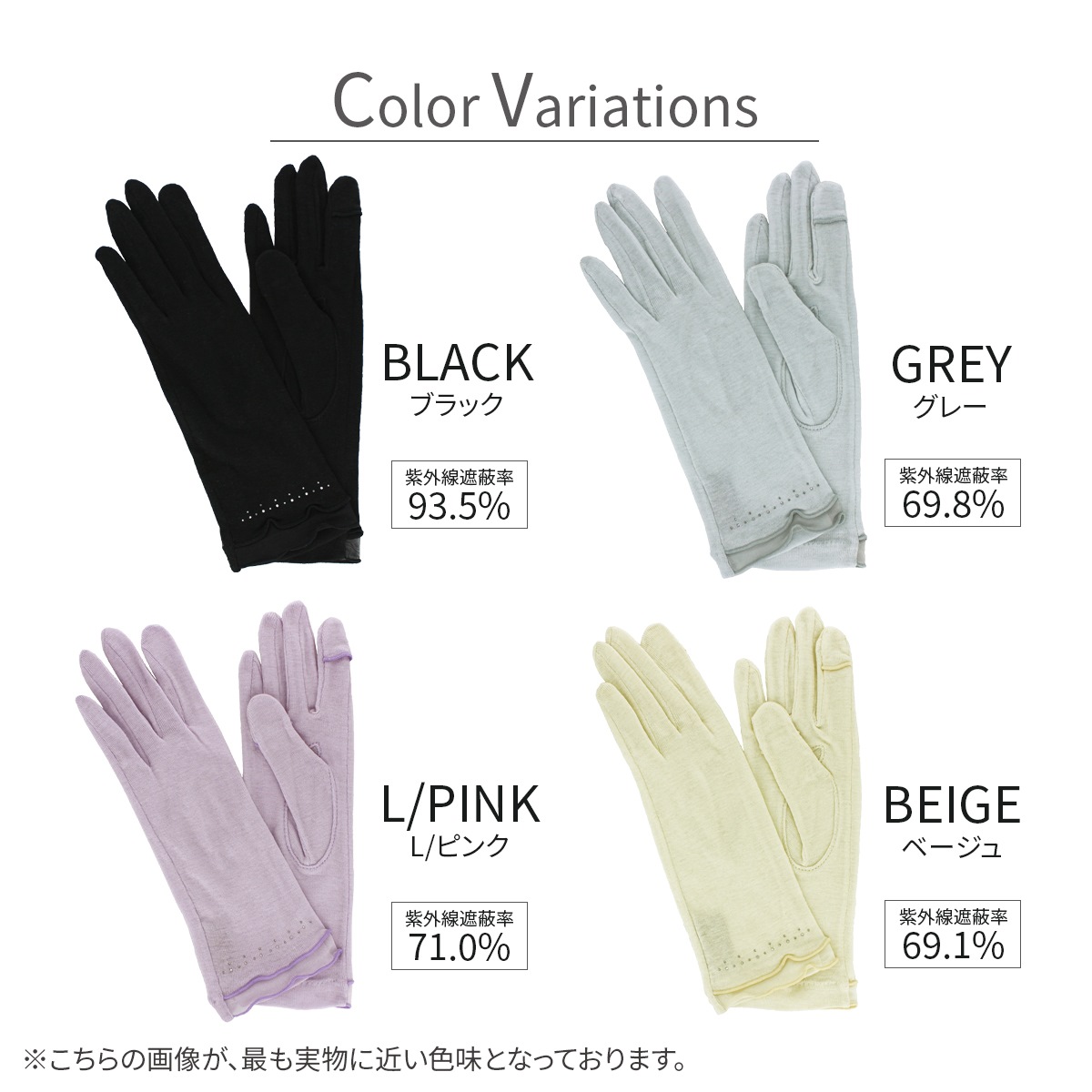 紫外線遮蔽率:ブラック 93.5%, グレー 69.8%, L/ピンク 71.0%, ベージュ 69.1%