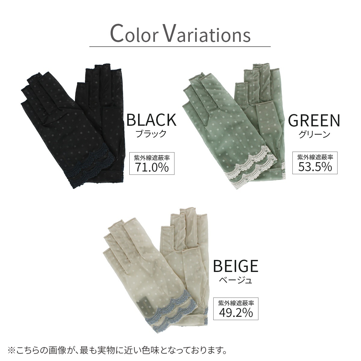 紫外線遮蔽率:ブラック 71.0%, グリーン 53.5%, ベージュ 49.2%