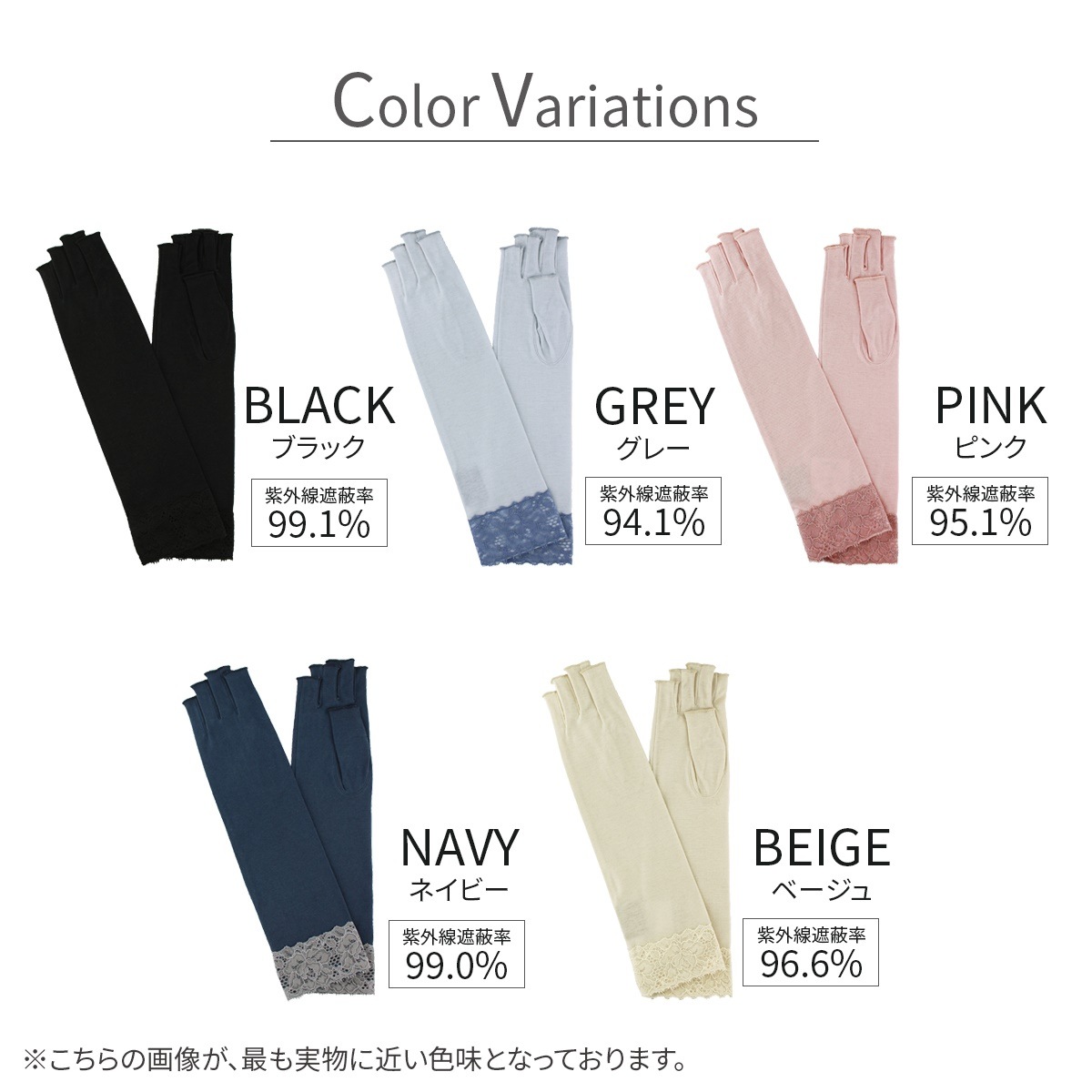 紫外線遮蔽率:ブラック 99.1%, グレー 94.1%, ピンク 95.1%, ネイビー 99.0%, ベージュ 96.6%