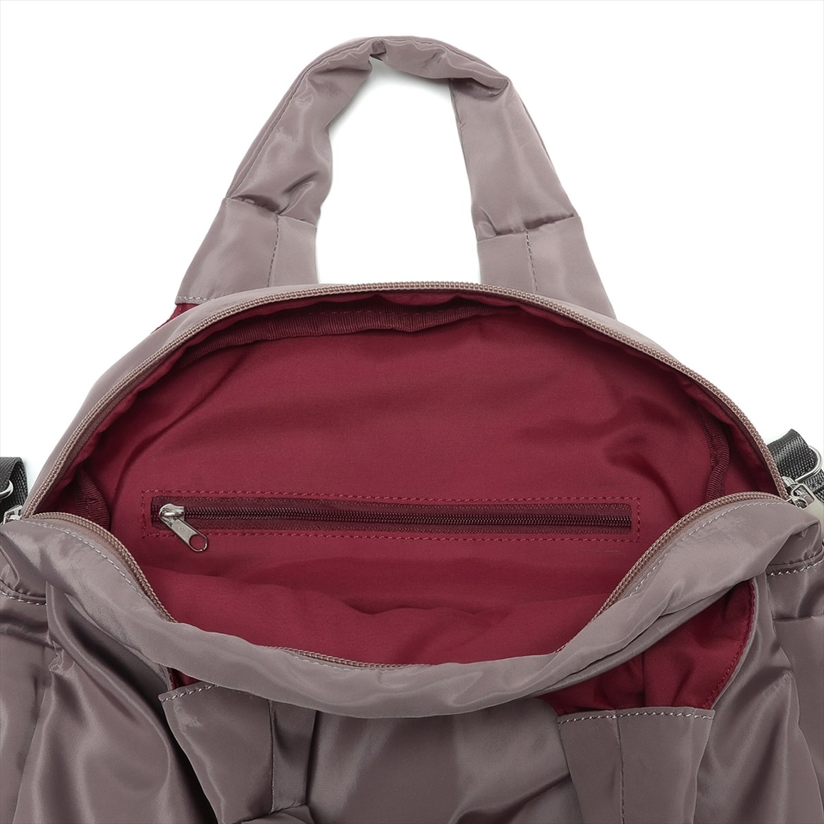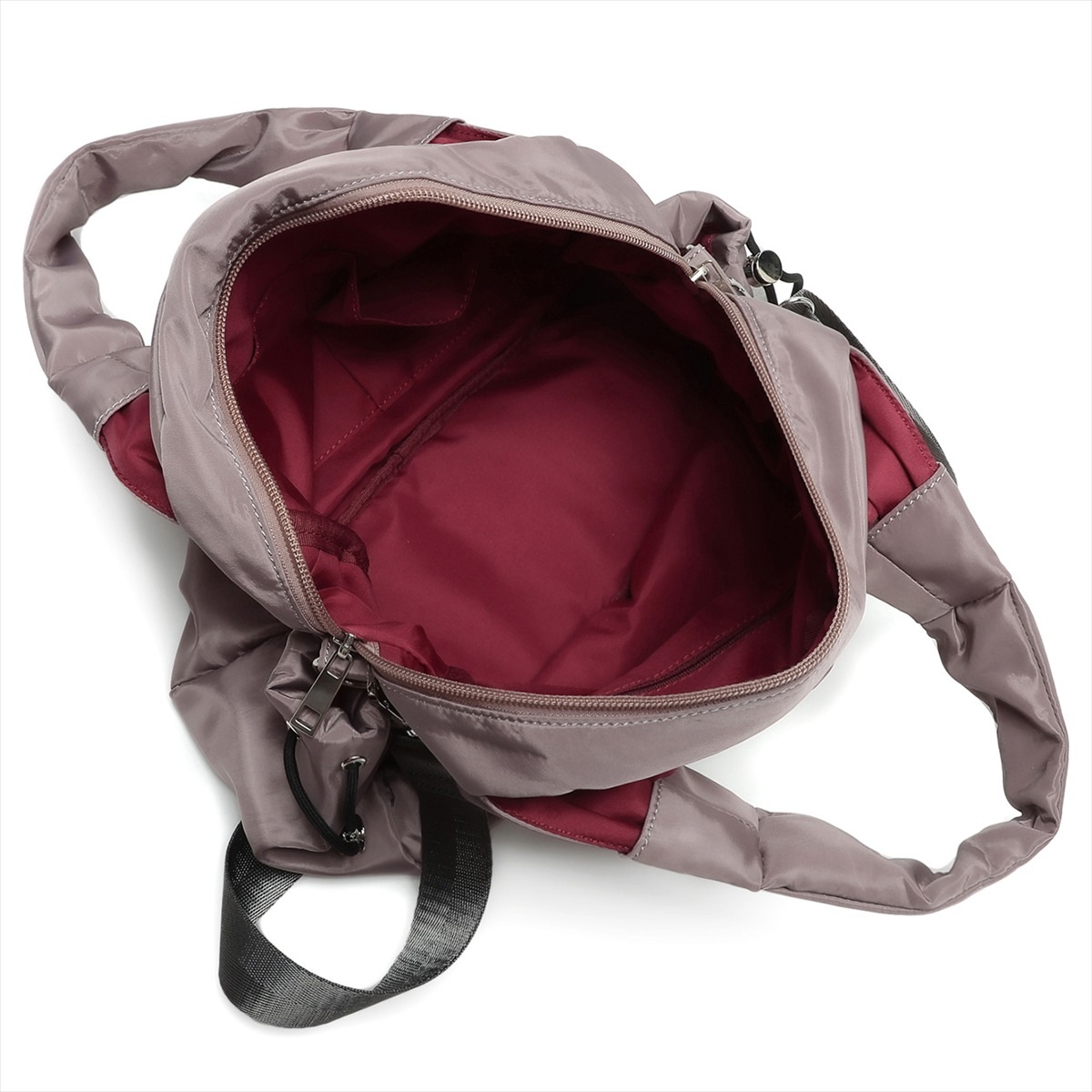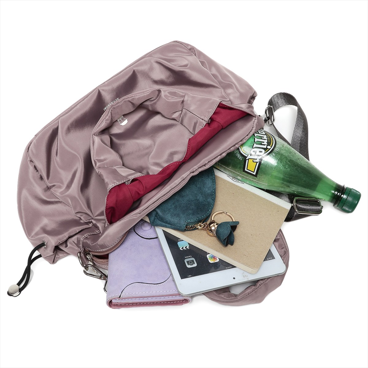 内側には小物が整理できるオープンポケット2つとファスナー付きポケット1つ、外側前面と背面にはマグネット付きポケットがそれぞれ1つ。サイドにはドローストリングポケットが左右それぞれにあります。開閉はファスナー仕様で中身が見えにくいので安心です。
