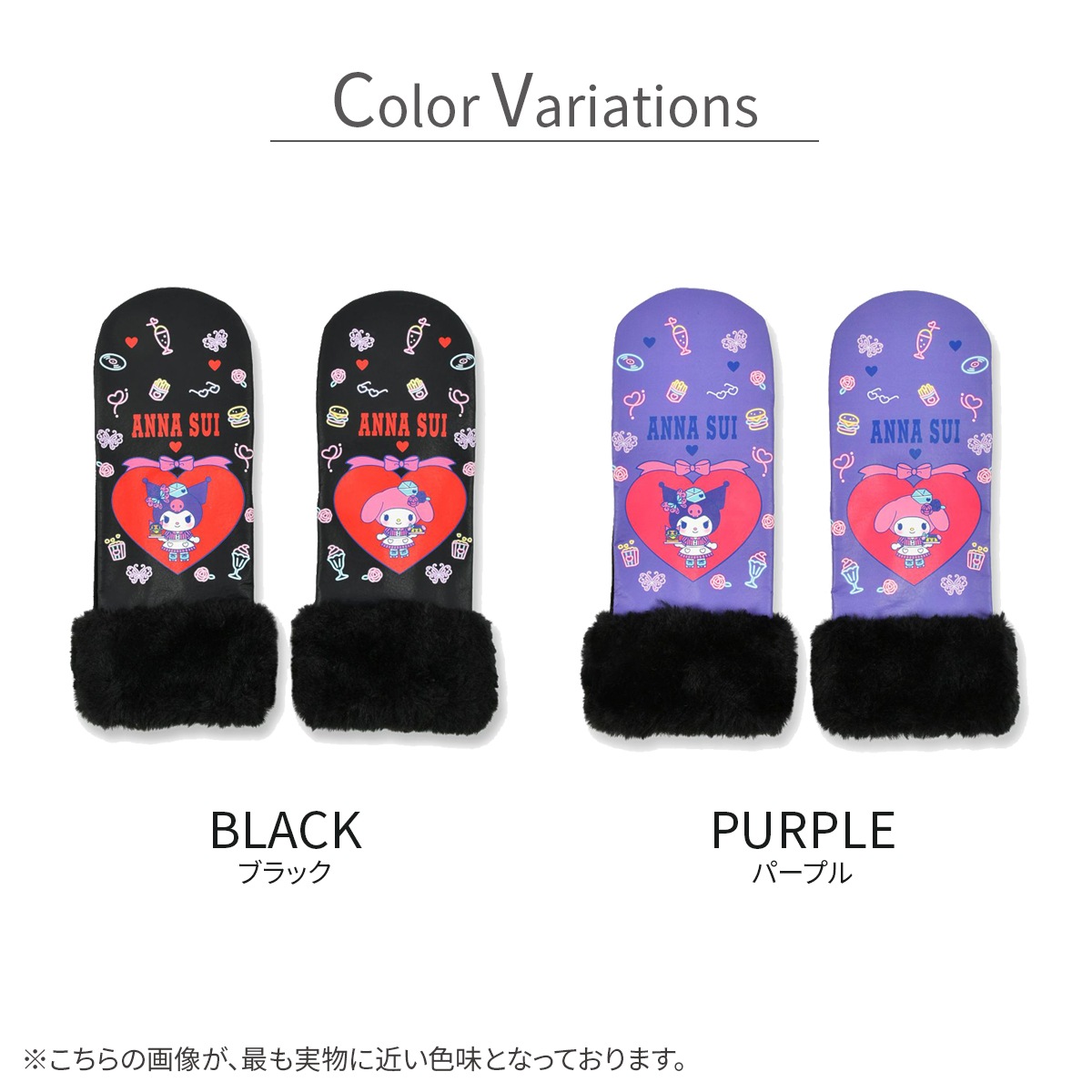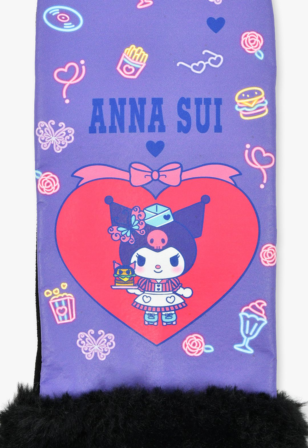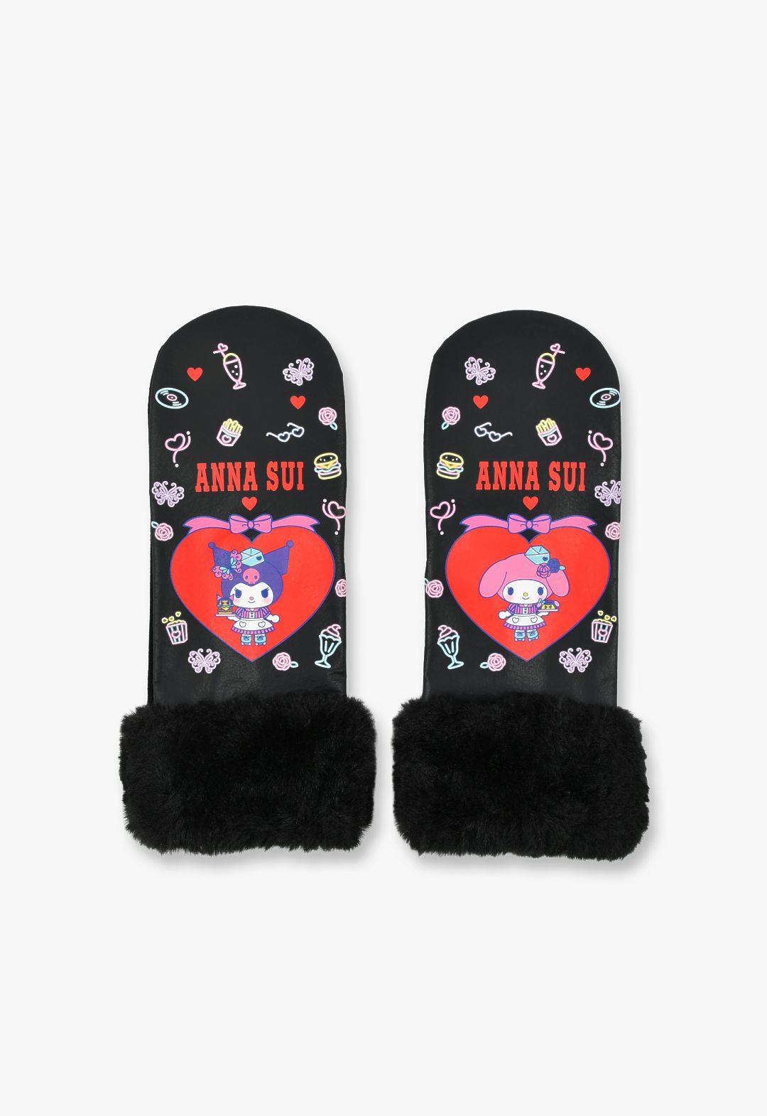 ANNA SUI×マイメロディ・クロミコラボシリーズ。マイメロ50th、クロミ20thを記念したANNA SUI × MY MELODY KUROMI スマホ対応ファー付きミトンです。繊細な柄を甲側にプリントで表現しました。アメリカンなウェイトレスになったマイメロとクロミがかわいい、つけていると楽しくなる手袋。必要に応じて、指だけを簡単に出すことが出来るスタイルのスマホ対応手袋で、直接スマートフォンに触れられるため、スワイプやクリック、指紋認証もでき機能性抜群です。寒い日でも手袋を外さずにすみ、暖かいまま過ごすことが出来ます。手元のファーが手首までしっかりと温めてくれます。