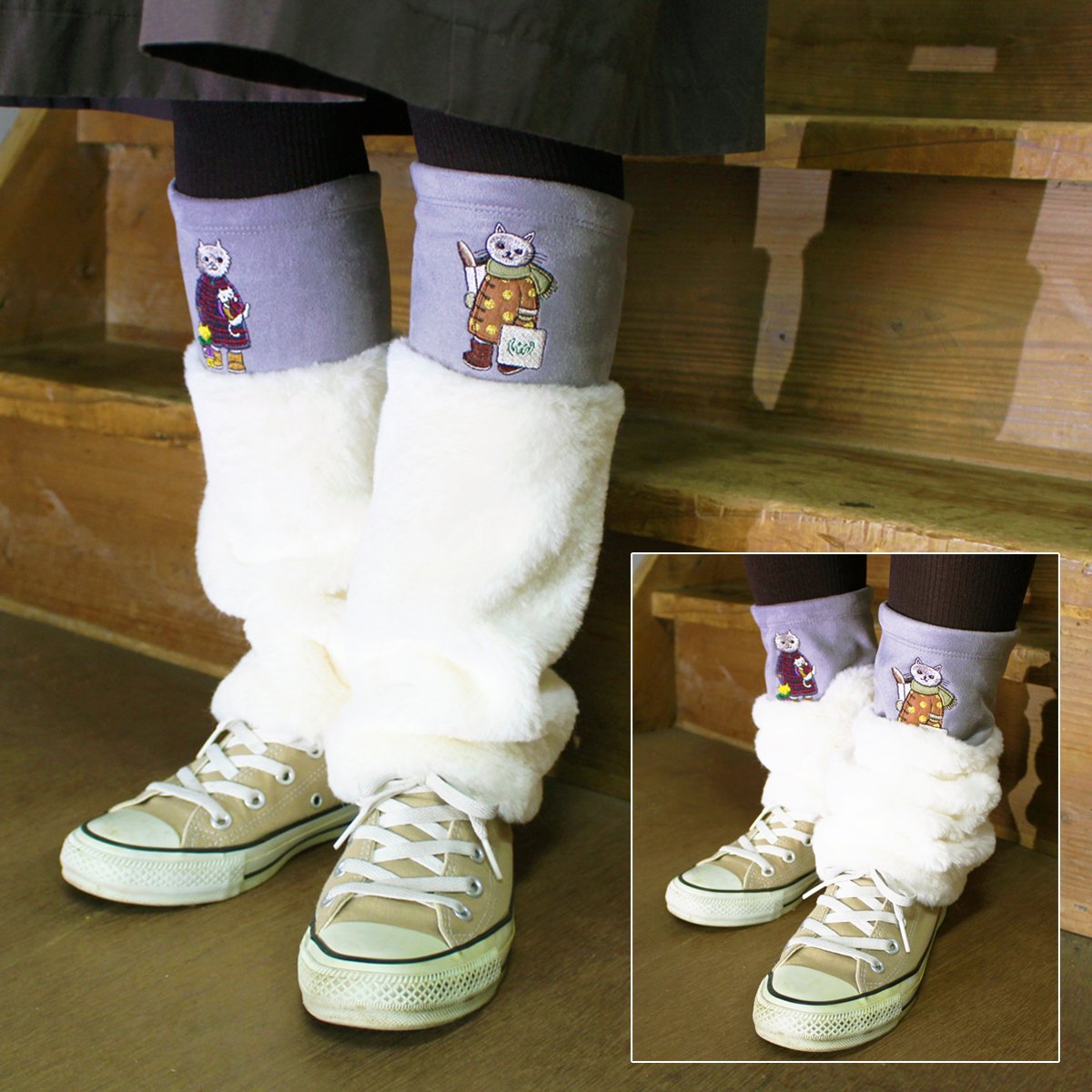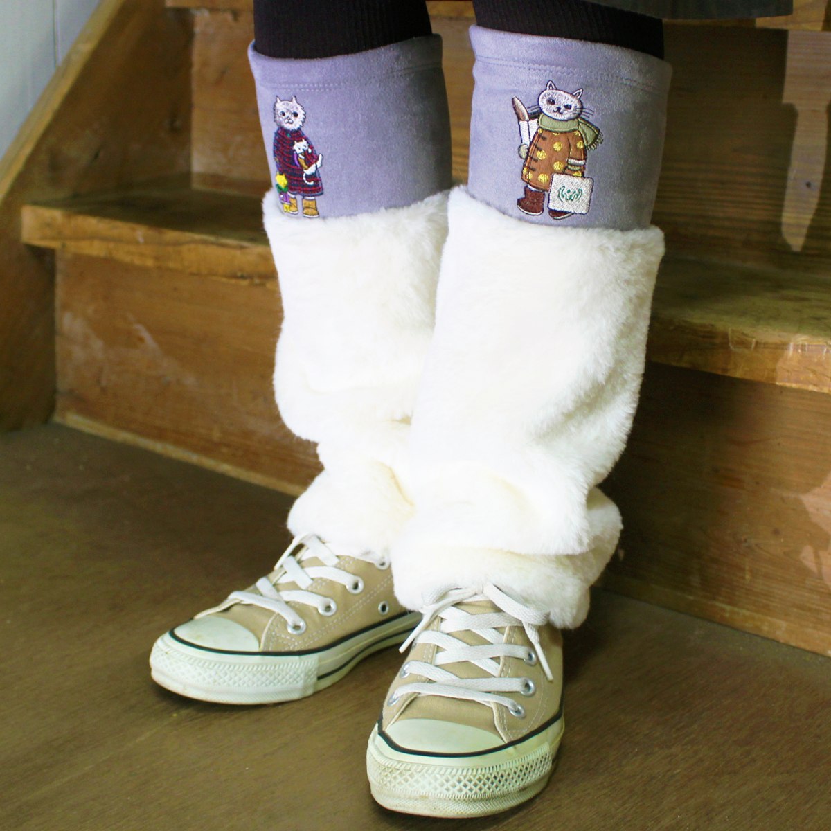 かわいいネコちゃんと肌触りの良いイミテーションファーが足元を心地よく温めてくれます。裾広がりのフレアデザインで、さっと履きやすく脱ぎやすい。着脱が簡単なのでオフィスやお家でのひと時におススメです。パソコン作業や家事をする時に冷える足元にプラスオンしてあったか。外出時はタイツとのコーディネートを楽しんだり、靴やブーツに被らせておしゃれに防寒ができます♪おしゃれと温活が叶うレッグウォーマーです。