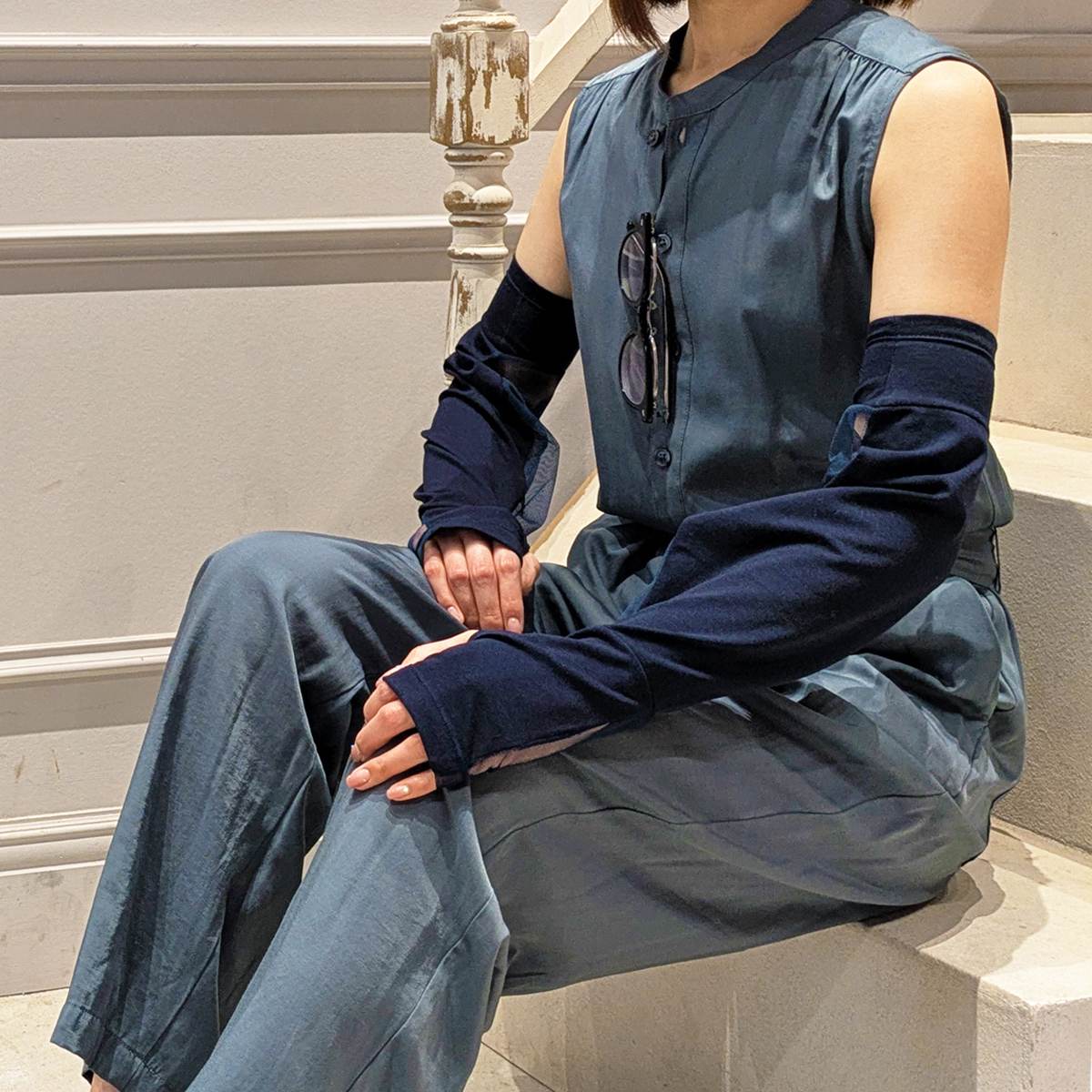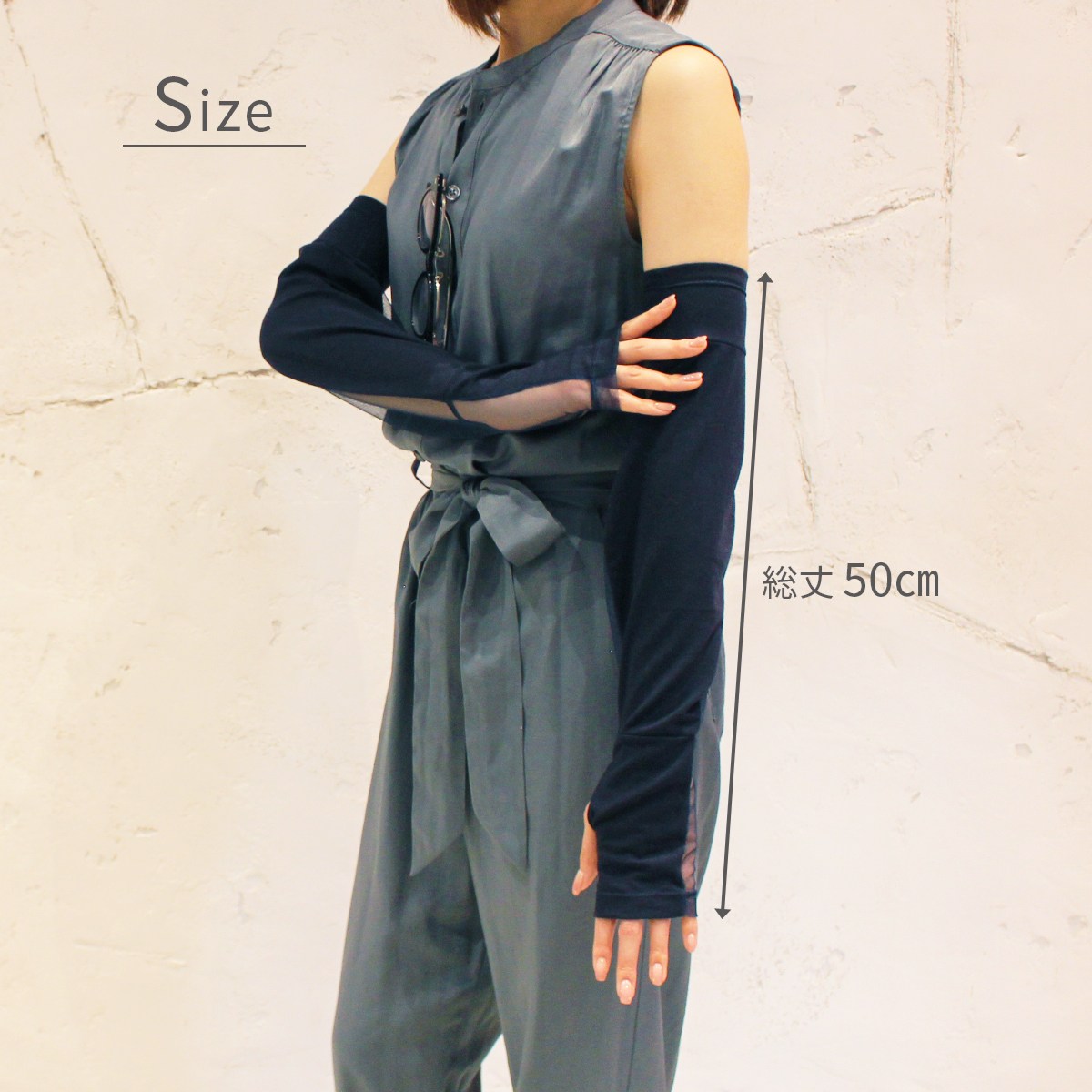 手肌にまとわりつくのが苦手な方はもちろんのこと、湿度の高い時期には生地を密着させずに風通りのよいシルエットが最適なバルーンスタイルのUVカット手袋です。絶対日焼けしたくない人のためにUPF50+,UVカット率99.8%以上の素材を用いました。ブラックとネイビーは紫外線遮蔽率100%!ロング丈で二の腕までしっかり紫外線対策出来ます。手の平側はメッシュになっており、通気性が良く蒸れにくく、暑い夏も快適です。手袋を装着したまま、細かい作業やコンビニでのキャッシュレス決済時にも慌てない指紋認証にも対応しているスマートフォンやタッチパネルがそのまま使える指先フリータイプです。つけそでの様なデザインでコーディネイトの幅が広がります。